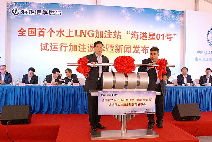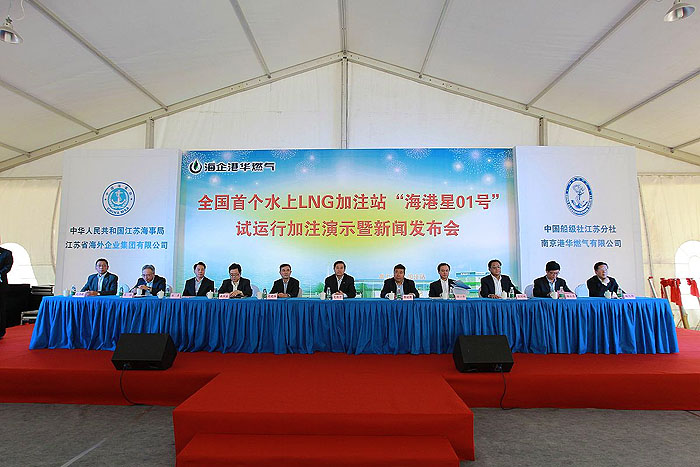 ????????9月26日下午,和風(fēng)旭日、萬(wàn)里無(wú)云。由江蘇海事局、中國(guó)船級(jí)社江蘇分社、江蘇省海外企業(yè)集團(tuán)有限公司、南京港華燃?xì)庥邢薰竟餐鬓k,江蘇海企港華燃?xì)獍l(fā)展有限公司承辦的全國(guó)首個(gè)水上LNG加注站——[海港星01號(hào)]試運(yùn)行加注演示暨新聞發(fā)布會(huì)在南京順利舉行。省政府史和平副省長(zhǎng)、國(guó)家交通部海事局李世新副局長(zhǎng)、以及省政府辦公廳、省國(guó)資委、省發(fā)改委、省經(jīng)信委、省交通廳、江蘇海事局、省能源局和南京、泰州兩市政府相關(guān)部門(mén)的領(lǐng)導(dǎo)出席了本次活動(dòng),海企集團(tuán)和海企技術(shù)公司領(lǐng)導(dǎo)班子全體人員也一同參加了活動(dòng)。本次活動(dòng)由江蘇海事局王士明副局長(zhǎng)主持。