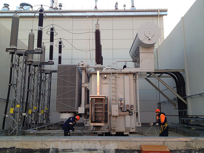 ????????我司成套工程部于2010年與國(guó)際知名的化工集團(tuán)蘇威公司簽訂的在俄大功率整流項(xiàng)目,經(jīng)過長(zhǎng)達(dá)兩年多的努力,通過與國(guó)際知名工程管理公司德希尼布通力合作,于2013年12月初完成了包括兩臺(tái)220千伏調(diào)壓變壓器和三臺(tái)22千伏整流變壓器的安裝調(diào)試工作。該項(xiàng)目有望于月底進(jìn)行試運(yùn)行。