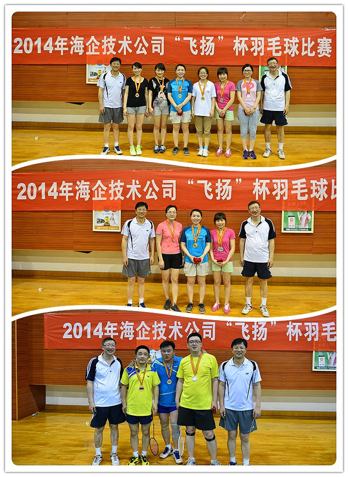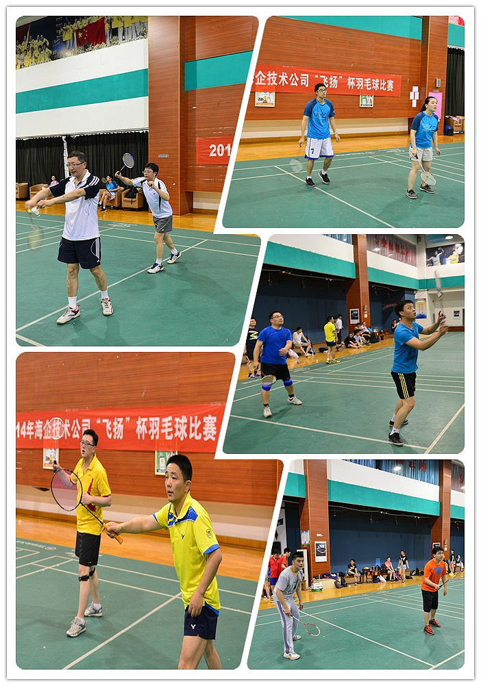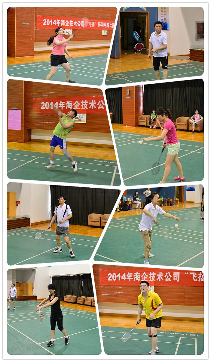 ????????5月16日下午13:30,2014年海企技術公司“飛揚”杯羽毛球比賽在中山東路全民健身中心順利舉辦。比賽共分四個項目:男單、女單、單雙、女雙,每個項目分冠、亞、季共12個獎項。公司員工積極參與,共有60人次報名參賽,總計進行了一百多場比賽。從小組循環賽到淘汰賽到最后的總決賽,參賽者們各個勁頭十足、活力四射。我司以幾位部門經理及副總為代表的種子選手,其高超的球技贏得滿堂喝彩,為整場比賽營造了輕松、歡樂的氣氛。比賽期間所有選手克服了體力嚴重透支的不利狀況,與強手過招,一路過關斬將,充分發揚了我司員工頑強拼搏、堅持到底的精神風貌。