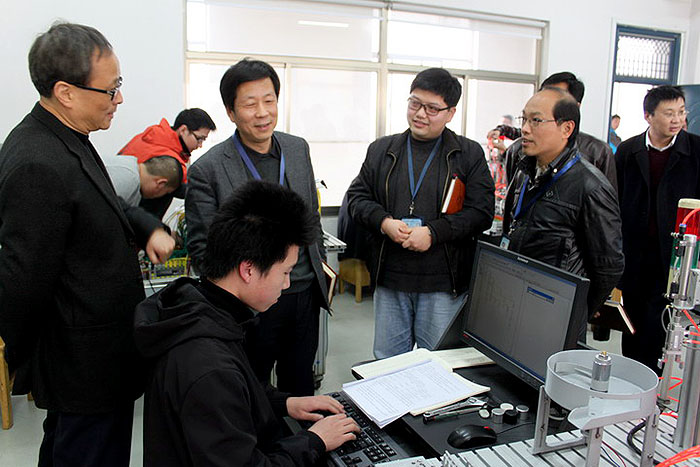 ????????劉維儉校長熱情地接待來賓,介紹了校園布局、辦學(xué)規(guī)模、辦學(xué)歷史等,陪同參觀了駐校企業(yè)常州航天創(chuàng)勝數(shù)控技術(shù)有限責(zé)任公司、數(shù)控實(shí)訓(xùn)車間、機(jī)電樓創(chuàng)新工作室、機(jī)電一體化實(shí)訓(xùn)室、PLC實(shí)驗(yàn)室、PLC實(shí)訓(xùn)室、電氣安裝與維修實(shí)訓(xùn)室、自動(dòng)控制實(shí)訓(xùn)室等機(jī)電專業(yè)科室。在就坐會(huì)議前給予來賓更直接、更直觀的感受。