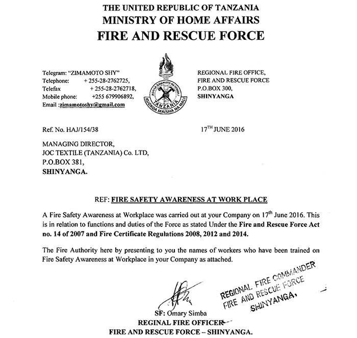 ????????6月19日下午14:00點,當地消防局培訓官Edward Lukuba先生與Hanafi Mkilindi先生在培訓室,對全體中國員工與坦桑員工進行了消防理論培訓,對滅火常識、滅火器消防栓的使用方法、疏散逃生、應急處置程序等進行了說明。培訓官針對紡織廠情況,針對失火時應如何報警,在消防員來到之前應怎樣斷電,如何隔離危險品,控制火勢蔓延,疏散員工到車間外空地等問題進行了詳細的說明,并在培訓后以問答的形式檢測和加強培訓內容。