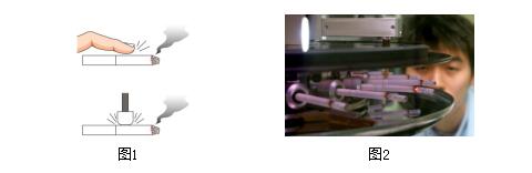 2.1細(xì)支煙燃燒錐落頭檢測(cè)技術(shù)及工藝改進(jìn) 1)燃燒錐落錐檢測(cè) 根據(jù)鄭州煙草學(xué)校倪克平等的研究[4],在煙絲填充值一定的情況下, 卷煙的硬度與單支克重存在著正比關(guān)系。細(xì)支煙由于其用絲量少,卷煙硬度也隨之減少,從而細(xì)支煙從外觀表現(xiàn)上來看比較“脆弱”,而國(guó)產(chǎn)細(xì)支煙燃燒錐落頭問題也較為嚴(yán)重。由于在韓國(guó)落錐問題經(jīng)常遭到用戶的投訴,細(xì)支煙燃燒落錐的測(cè)試在韓國(guó)KT&G已經(jīng)作為一項(xiàng)重要的日常檢測(cè)指標(biāo)。根據(jù)筆者的調(diào)研,國(guó)內(nèi)目前對(duì)于煙支燃燒的落錐這一重要指標(biāo)尚沒有相關(guān)檢測(cè)標(biāo)準(zhǔn),鄭州煙草研究院的李斌等[5]用自制的旋轉(zhuǎn)裝置對(duì)卷煙燃燒錐落頭進(jìn)行過研究分析。但是其分析過程中并沒有模擬人彈煙過程中的外加食指作用力,如圖1。從而無法模擬真實(shí)的用戶彈煙落錐過程。目前在韓國(guó)KT&G煙草人參公社,他們采用了自行研發(fā)的轉(zhuǎn)盤式20通道卷煙落錐測(cè)試分析儀對(duì)細(xì)支煙的燃燒落錐進(jìn)行模擬測(cè)試分析,在完全模擬人的抽吸以及手指彈灰的條件下對(duì)卷煙落錐進(jìn)行檢測(cè)。如圖2。通過這樣的模擬標(biāo)準(zhǔn)化檢測(cè)手段,韓國(guó)KT&G不斷的改善制絲和卷接的生產(chǎn)工藝,最終生產(chǎn)出優(yōu)質(zhì)的細(xì)支煙。